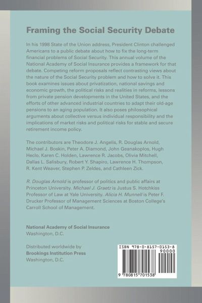 " In his 1998 State of the Union address, President Clinton challenged Americans to a public debate about how to fix the long-term financial problems of Social Security. This annual volume of the National Academy of Social Insurance provides a framework for that debate. Competing reform proposals reflect contrasting views about the nature of the Social Security problem and how to solve it. This book examines issues about privatization, national savings and economic growth, the political risks and realities in reforms, lessons from private pensions developments in the United States, and the efforts of other advanced industrial countries to adapt their old-age pensions to an aging population. It also poses philosophical arguments about collective versus individual responsibility and the implications of market risks and political risks for stable and secure retirement income policy. The contributors are Theo Angelis, Michael J. Boskin, Peter A. Diamond, John Geanakoplos, Hugh Heclo, Karen C. Holden, Howell Jackson, Olivia Mitchell, Dallas L. Salisbury, Lawrence H. Thompson, Kent Weaver, and Stephen P. Zeldes. Copublished with the National Academy of Social Insurance"