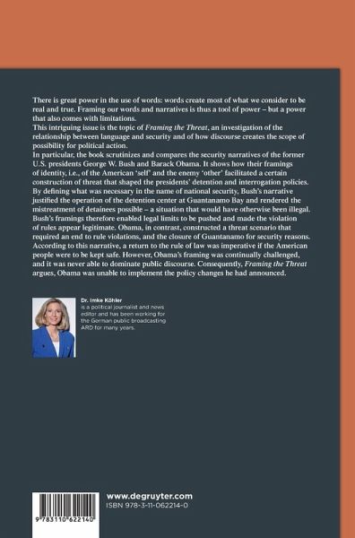 In particular, the book scrutinizes and compares the security narratives of the former US presidents George W. Bush and Barack Obama. It shows how their framings of identity, i.e., of the American 'self' and the enemy 'other' facilitated a certain construction of threat that shaped the presidents' detention and interrogation policies. By defining what was necessary in the name of national security, Bush's narrative justified the operation of the detention center at Guantanamo Bay and rendered the mistreatment of detainees possible - a situation that would have otherwise been illegal. Bush's framings therefore enabled legal limits to be pushed and made the violation of rules appear legitimate. Obama, in contrast, constructed a threat scenario that required an end to rule violations, and the closure of Guantanamo for security reasons. According to this narrative, a return to the rule of law was imperative if the American people were to be kept safe. However, Obama's framing was continually challenged, and it was never able to dominate public discourse. Consequently, Framing the Threat argues Obama was unable to implement the policy changes he had announced.