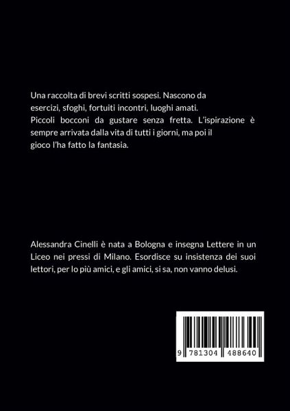 Una raccolta di brevi scritti sospesi. Nascono da esercizi, sfoghi, fortuiti incontri, luoghi amati. Piccoli bocconi da gustare senza fretta. L'ispirazione è sempre arrivata dalla vita di tutti i giorni, ma poi il gioco l'ha fatto la fantasia.
