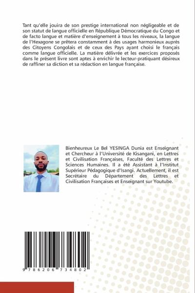 Tant qu'elle jouira de son prestige international non négligeable et de son statut de langue officielle en République Démocratique du Congo et de facto langue et matière d'enseignement à tous les niveaux, la langue de l'Hexagone se prêtera constamment à des usages harmonieux auprès des Citoyens Congolais et de ceux des Pays ayant choisi le français comme langue officielle. La matière délivrée et les exercices proposés dans le présent livre sont aptes à enrichir le lecteur-pratiquant désireux de raffiner sa diction et sa rédaction en langue française.