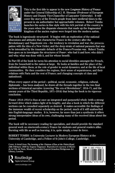 Here is an incomparably rich portrait of France in the years when the disparate elements that made up the fragmented kingdom of the ancien regime were forged into the modern nation. The survey begins with an exploration of national obsessions and attitudes. It considers the tendency to revolution and war, the preoccupation with the idea of a New Order and the deep strain of national paranoia that was to be intensified by the dramatic debacle of the Franco-Prussian War. Robert Tombs then investigates the structures of power and in Part Three he turns his attention to social identities, from the individual and family to the nation at large. When every aspect of the period has been put under the microscope, Robert Tombs draws them all into the broad political narrative that brings the book to its rousing conclusion. Bursting with life as well as learning, this is, quite simply, a tour de force.