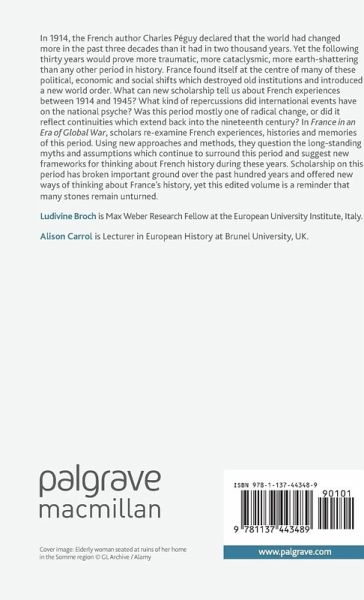 In France in an Era of Global War, scholars re-examine experiences of French politics, occupation, empire and entanglements with the Anglophone world between 1914 and 1945. In doing so, they question the long-standing myths and assumptions which continue to surround this period, and offer new avenues of enquiry.