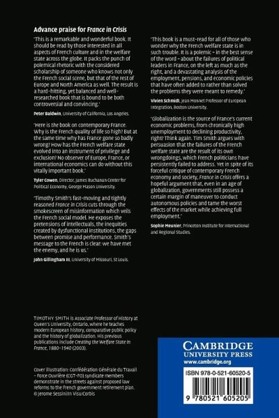 France is in crisis. In this provocative account, Timothy Smith argues that the French economic and social model is collapsing inward on itself, the result of good intentions, bad policies, and vested interests who employ the rhetoric of 'solidarity' to prevent change. French social policy is not redistributive; indeed, Smith argues, the majority of 'social' spending serves to strengthen existing inequalities. He shows how politicians, intellectuals and labor leaders have invoked the specter of 'globalization' to explain homegrown problems and delay reform. Professor Smith makes frequent comparisons with the USA, UK, Canada, Scandinavia, Germany and the Netherlands and argues that change need not follow the inegalitarian US or British paths but instead can lead to a more equal society. Written in a lively style, this is an unusual blend of history, policy analysis, economics and political commentary and will be indispensable reading for anyone seeking to understand France's malaise.