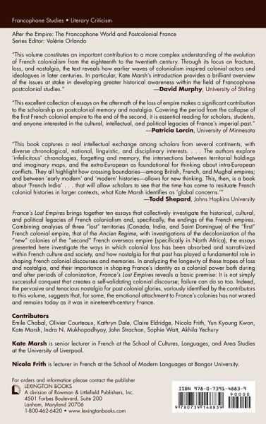 This collection of essays investigates the fundamental role that the loss of colonial territories at the end of the Ancient Regime and post-World War II has played in shaping French memories and colonial discourses. In identifying loss and nostalgia as key tropes in cultural representations, these essays call for a re-evaluation of French colonialism as a discourse informed not just by narratives of conquest, but equally by its histories of defeat.