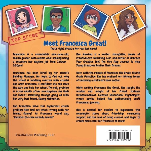 Francesca is a remarkable nine-year-old, fourth grader, with autism who's making being a detective her daytime job from 7:00am - 3:30pm! Francesca has been hired by her school's Building Manager, Mr. Kyle, to find out why the school is suddenly overrun with crumbs and ants! Francesca is confident she can solve the case, and help her school. The only problem is, in the middle of her investigation, she finds out there's something strange going on with her very best friend, Danny McPherson. Can Francesca solve this mysterious crumb problem AND find out what's wrong with her friend, Danny? As Francesca would say, "Consider the case already solved!"