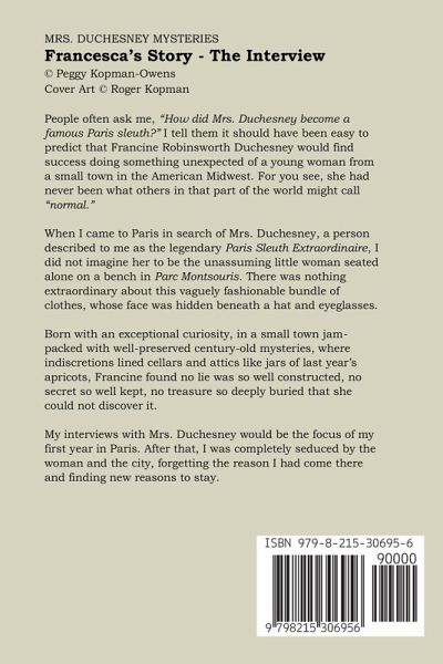 Cover Art © Roger Kopman. People often ask me, "How did Mrs. Duchesney become a famous Paris sleuth?" I tell them it should have been easy to predict that Francine Robinsworth Duchesney would find success doing something unexpected of a young woman from a small town in the American Midwest. For you see, she had never been what others in that part of the world might call normal. When I came to Paris in search of Mrs. Duchesney, a person described to me as the legendary Paris Sleuth Extraordinaire, I did not imagine her to be the unassuming little woman seated alone on a bench in Parc Montsouris. There was nothing extraordinary about this vaguely fashionable bundle of clothes, whose face was hidden beneath a hat and eyeglasses. Born with an exceptional curiosity, in a small town jam-packed with well-preserved century-old mysteries, where indiscretions lined cellars and attics like jars of last year's apricots, Francine found no lie was so well constructed, no secret so well kept, no treasure so deeply buried that she could not discover it. My interviews with Mrs. Duchesney would be the focus of my first year in Paris. After that, I was completely seduced by the woman and the city, forgetting the reason I had come there and finding new reasons to stay.