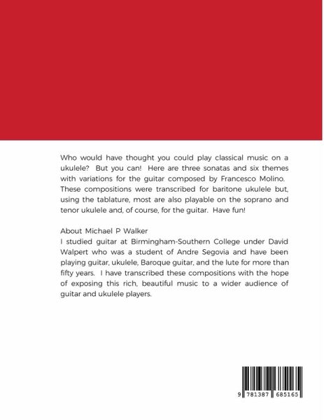 Who would have thought you could play classical music on a ukulele? But you can! Here are three sonatas and six themes with variations for the guitar composed by Francesco Molino. These compositions were transcribed for baritone ukulele but, using the tablature, most are also playable on the soprano and tenor ukulele and, of course, for the guitar. Have fun!