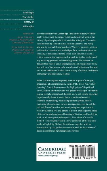 When the New Organon appeared in 1620, part of a six-part programme of scientific inquiry entitled 'The Great Renewal of Learning', Francis Bacon was at the high point of his political career, and his ambitious work was groundbreaking in its attempt to give formal philosophical shape to a new and rapidly emerging experimentally-based science. Bacon combines theoretical scientific epistemology with examples from applied science, examining phenomena as various as magnetism, gravity, and the ebb and flow of the tides, and anticipating later experimental work by Robert Boyle and others. His work challenges the entire edifice of the philosophy and learning of his time, and has left its mark on all subsequent philosophical discussions of scientific method. This volume presents a new translation of the text into modern English by Michael Silverthorne, and an introduction by Lisa Jardine that sets the work in the context of Bacon's scientific and philosophical activities.