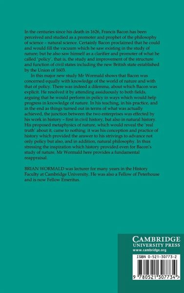 In the centuries since his death, Francis Bacon has been perceived as a promoter and prophet of 'natural science'. Certainly Bacon expected to fill the vacuum which he saw existing in the study of nature; but he also saw himself as a clarifier and promoter of what he called 'policy', that is, the study and improvement of the structure and function of civil states including the then new British state. In this major new study, Brian Wormald's first since his work on Clarendon, Bacon is shown resolving this conflict by attending assiduously to both fields, arguing that work on one would help progress in the other. In his teaching, in his practice, and in terms of what was actually achieved, the junction between the two enterprises was affected by Bacon's work in history - civil and natural. In this fundamental reappraisal of one of the most complex and innovative figures of the age, Brian Wormald reveals how Bacon's conception and practice of history provided an answer to his strivings in both policy and natural philosophy.