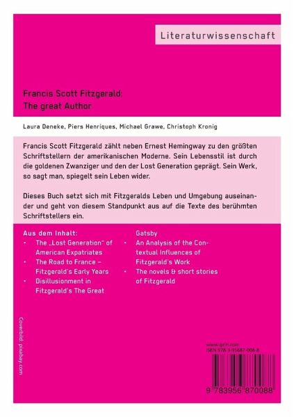 Francis Scott Fitzgerald zählt neben Ernest Hemingway zu den größten Schriftstellern der amerikanischen Moderne. Sein Lebensstil ist durch die goldenen Zwanziger und den der Lost Generation geprägt. Sein Werk, so sagt man, spiegelt sein Leben wider. Dieses Buch setzt sich mit Fitzgeralds Leben und Umgebung auseinander und geht von diesem Standpunkt aus auf die Texte des berühmten Schriftstellers ein.Aus dem Inhalt:The "Lost Generation" of American Expatriates, The Road to France - Fitzgerald's Early Years, Disillusionment in Fitzgerald's The Great Gatsby, An Analysis of the Contextual Influences of Fitzgerald's Work, The novels & short stories of Fitzgerald