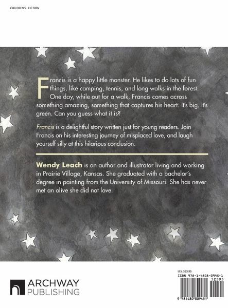 Francis is a happy little monster. He likes to do lots of fun things, like camping, tennis, and long walks in the forest. One day, while out for a walk, Francis comes across something amazing, something that captures his heart. It’s big. It’s green. Can you guess what it is? Francis is a delightful story written just for young readers. Join Francis on his interesting journey of misplaced love, and laugh yourself silly at this hilarious conclusion.