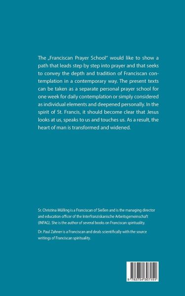 The "Franciscan Prayer School" would like to show a path that leads step by step into prayer and that seeks to convey the depth and tradition of Franciscan contemplation in a contemporary way. The present texts can be taken as a separate personal prayer school for one week for daily contemplation or simply considered as individual elements and deepened personally. In the spirit of St. Francis, it should become clear that Jesus looks at us, speaks to us and touches us. As a result, the heart of man is transformed and widened.