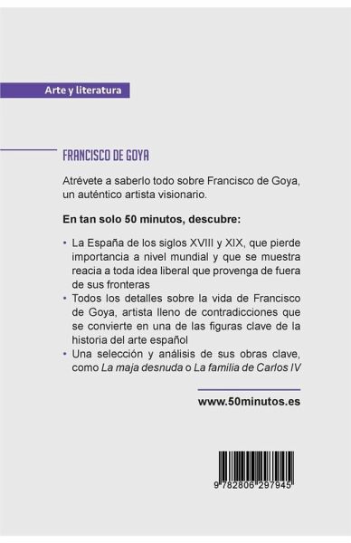 En el siglo XVIII, en plena Ilustración, España se ha convertido en una potencia de segunda categoría que se muestra reacia a la entrada de esta corriente de pensamiento en la península. En ese contexto, Goya, partidario de los afrancesados, vive en una constante dicotomía, dado que es pintor de la corte. Este artista, que introduce la crítica social en su obra y que se interesa por temas poco habituales, como el lado oscuro del ser humano, revoluciona el arte y su influencia es destacable. En tan solo 50 minutos te invitamos a descubrir: ¿ La biografía de Francisco de Goya, pintor de corte y figura emblemática del arte español, que se muestra partidario de los ideales de la Ilustración, lo que acabará llevándolo al exilio ¿ El marco histórico de la España del siglo XVIII y de principios del XIX, una potencia venida a menos que se encuentra aislada filosófica y políticamente del resto de la Europa ilustrada ¿ La obra de Francisco de Goya, que se caracteriza por plasmar a la perfección la personalidad de sus personajes en sus retratos y por captar un sentido de la luz preciso y delicado SOBRE 50MINUTOS.ES Arte y literatura 50MINUTOS.ES te invita a profundizar en el mundo del arte, para que te conviertas en un experto y lo sepas todo sobre la vida y obra de artistas de la talla de Francisco de Goya o Jan van Eyck y de célebres escritores como Albert Camus o Miguel de Cervantes, además de permitirte explorar grandes movimientos literarios que han transformado el universo cultural, como el romanticismo o el simbolismo. Nuestras obras analizan de forma clara y sencilla la trayectoria personal y artística de grandes figuras del mundo de la cultura y te dan la oportunidad de conocer los principales movimientos literarios. ¡Mejora tu cultura y deja a todos boquiabiertos! ¡Saberlo todo sobre el mundo de la cultura nunca fue tan sencillo!