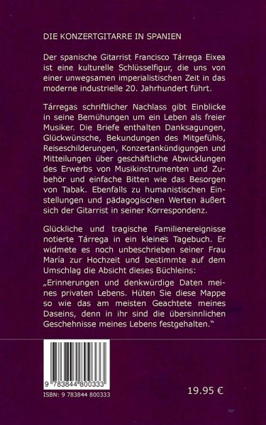 Der spanische Gitarrist Francisco Tárrega Eixea ist eine kulturelle Schlüsselfigur, die uns von einer unwegsamen imperialistischen Zeit in das moderne industrielle 20. Jahrhundert führt. Tárregas schriftlicher Nachlass gibt Einblicke in seine Bemühungen um ein Leben als freier Musiker. Die Briefe enthalten Danksagungen, Glückwünsche, Bekundungen des Mitgefühls, Reiseschilderungen, Konzertankündigungen und Mitteilungen über geschäftliche Abwicklungen des Erwerbs von Musikinstrumenten und Zubehör und einfache Bitten wie das Besorgen von Tabak. Ebenfalls zu humanistischen Einstellungen und pädagogischen Werten äußert sich der Gitarrist in seiner Korrespondenz.Glückliche und tragische Familienereignisse notierte Tárrega in ein kleines Tagebuch. Er widmete es noch unbeschrieben seiner Frau María zur Hochzeit und bestimmte auf dem Umschlag die Absicht dieses Büchleins: "Erinnerungen und denkwürdige Daten meines privaten Lebens. Hüten Sie diese Mappe so, wie das am meisten Geachtete meines Daseins, denn in ihr sind die übersinnlichen Geschehnisse meines Lebens festgehalten."