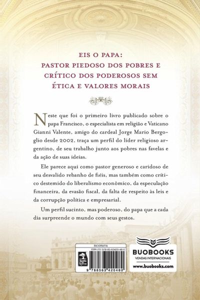 Eis o papa: pastor piedoso dos pobres e crítico dos poderosos sem ética e valores morais Neste que foi o primeiro livro publicado sobre o papa Francisco, o especialista em religião e Vaticano Gianni Valente, amigo do cardeal Jorge Mario Bergoglio desde 2002, traça um perfil do líder religioso argentino, de seu trabalho junto aos pobres nas favelas e da ação de suas ideias. Ele parece aqui como pastor generoso e caridoso de seu desvalido rebanho de fiéis, mas também como crítico destemido do liberalismo econômico, da especulação financeira, da evasão fiscal, da falta de respeito às leis e da corrupção política e empresarial. Um perfil sucinto, mas poderoso, do papa que a cada dia surpreende o mundo com seus gestos.