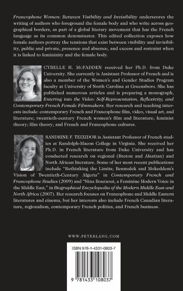 The Editors: Cybelle H. McFadden received her Ph.D. from Duke University. She currently is Assistant Professor of French and is also a member of the Women¿s and Gender Studies Program faculty at the University of North Carolina at Greensboro. She has published numerous articles and is preparing a monograph, Entering into the Video: Self-Representation, Reflexivity, and Contemporary French Female Filmmakers. Her research and teaching interests include: contemporary French and Francophone film, video, visual art, and literature; twentieth-century French women¿s film and literature; feminist theory; film theory; and French and Francophone cultures. Sandrine F. Teixidor is Assistant Professor of French studies at Randolph-Macon College in Virginia. She received her Ph.D. in French literature from Duke University and has conducted research on regional (Breton and Alsatian) and North African Literature. Some of her most recent publications include «Rethinking the Limits; Benmalek and Mokeddem¿s Vision of Twentieth-Century Algeria» in Contemporary French and Francophone Studies (2009) and «Nina Bouraoui, a Feminine Modern Voice in the Middle East», in Biographical Encyclopedia of the Modern Middle East and North Africa (2007). Her research focuses on Francophone and Middle Eastern literatures and cinema, but her interests also include French Canadian literature, regionalism, contemporary French politics, and French business.