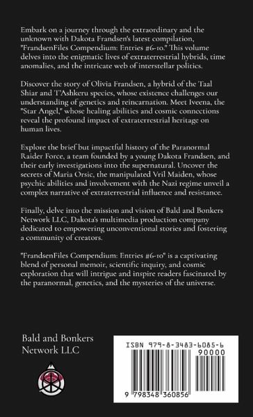 Embark on a journey through the extraordinary and the unknown with Dakota Frandsen's latest compilation, "FrandsenFiles Compendium: Entries #6-10." This volume delves into the enigmatic lives of extraterrestrial hybrids, time anomalies, and the intricate web of interstellar politics. Discover the story of Olivia Frandsen, a hybrid of the Taal Shiar and T'Ashkeru species, whose existence challenges our understanding of genetics and reincarnation. Meet Iveena, the "Star Angel," whose healing abilities and cosmic connections reveal the profound impact of extraterrestrial heritage on human lives. Explore the brief but impactful history of the Paranormal Raider Force, a team founded by a young Dakota Frandsen, and their early investigations into the supernatural. Uncover the secrets of Maria Orsic, the manipulated Vril Maiden, whose psychic abilities and involvement with the Nazi regime unveil a complex narrative of extraterrestrial influence and resistance. Finally, delve into the mission and vision of Bald and Bonkers Network LLC, Dakota's multimedia production company dedicated to empowering unconventional stories and fostering a community of creators. "FrandsenFiles Compendium: Entries #6-10" is a captivating blend of personal memoir, scientific inquiry, and cosmic exploration that will intrigue and inspire readers fascinated by the paranormal, genetics, and the mysteries of the universe.