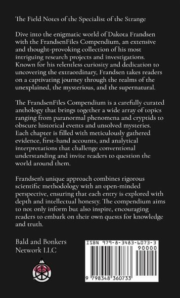 The Field Notes of the Specialist of the Strange Dive into the enigmatic world of Dakota Frandsen with the FrandsenFiles Compendium, an extensive and thought-provoking collection of his most intriguing research projects and investigations. Known for his relentless curiosity and dedication to uncovering the extraordinary, Frandsen takes readers on a captivating journey through the realms of the unexplained, the mysterious, and the supernatural. The FrandsenFiles Compendium is a carefully curated anthology that brings together a wide array of topics ranging from paranormal phenomena and cryptids to obscure historical events and unsolved mysteries. Each chapter is filled with meticulously gathered evidence, first-hand accounts, and analytical interpretations that challenge conventional understanding and invite readers to question the world around them. Frandsen's unique approach combines rigorous scientific methodology with an open-minded perspective, ensuring that each entry is explored with depth and intellectual honesty. The compendium aims to not only inform but also inspire, encouraging readers to embark on their own quests for knowledge and truth.