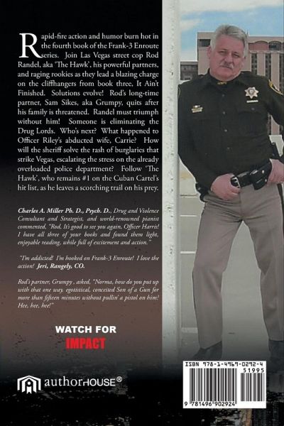 Rapid-fire action and humor burn hot in the fourth book of the Frank-3 Enroute series. Join Las Vegas street cop Rod Randel, aka ?The Hawk?, his powerful partners, and raging rookies as they lead a blazing charge on the cliffhangers from book three, It Ain?t Finished. Solutions evolve! Rod?s long-time partner, Sam Sikes, aka Grumpy, quits after his family is threatened. Randel must triumph without him! Someone is eliminating the Drug Lords. Who?s next? What happened to Officer Riley?s abducted wife, Carrie? How will the sheriff solve the rash of burglaries that strike Vegas, escalating the stress on the already overloaded police department? Follow ?The Hawk?, who remains #1 on the Cuban Cartel?s hit list, as he leaves a scorching trail on his prey. 124words