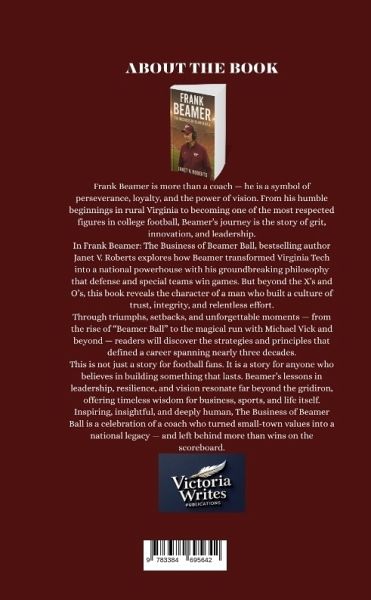 Frank Beamer's story is the story of college football's transformation - and the man who quietly redefined how the game could be played. From a small-town upbringing in Hillsville, Virginia, to becoming one of the winningest coaches in NCAA history, Beamer built his career on values that never went out of style: loyalty, hard work, and belief in the power of a team.In Frank Beamer: The Business of Beamer Ball, bestselling author Janet V. Roberts takes readers deep into the life and legacy of the legendary Virginia Tech coach. Beamer's revolutionary approach - known as "Beamer Ball" - turned defense and special teams into game-changing weapons, giving the Hokies a national identity and fans unforgettable memories. But his legacy is not only in the victories. It's in the lessons of leadership, resilience, and character that continue to inspire players, coaches, and leaders across every walk of life.Through unforgettable moments - from early struggles to breakthrough seasons, the rise of Michael Vick, and Virginia Tech's run to the national championship - this book reveals the strategy, philosophy, and vision that powered Beamer's remarkable career.More than a sports biography, this is a handbook for success in any field. Whether you're a coach, athlete, business leader, or simply someone who believes in building something that lasts, Beamer's story offers timeless wisdom for achieving greatness while staying true to your roots.Inspiring, insightful, and deeply human, The Business of Beamer Ball is the ultimate celebration of a coach who changed the game - and proved that real success is measured not just in wins, but in the lives you touch