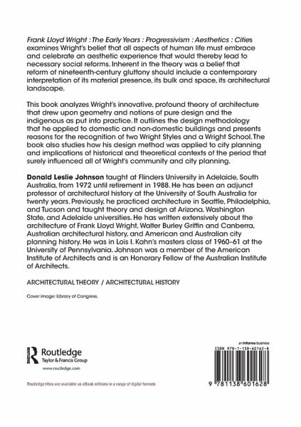 Frank Lloyd Wright : The Early Years : Progressivism : Aesthetics : Cities examines Wright's belief that all aspects of human life must embrace and celebrate an aesthetic experience that would thereby lead to necessary social reforms. Inherent in the theory was a belief that reform of nineteenth-century gluttony should include a contemporary interpretation of its material presence, its bulk and space, its architectural landscape. This book analyzes Wright's innovative, profound theory of architecture that drew upon geometry and notions of pure design and the indigenous as put into practice. It outlines the design methodology that he applied to domestic and non-domestic buildings and presents reasons for the recognition of two Wright Styles and a Wright School. The book also studies how his design method was applied to city planning and implications of historical and theoretical contexts of the period that surely influenced all of Wright's community and city planning.