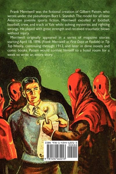 Frank Merriwell was the fictional creation of Gilbert Patten, who wrote under the pseudonym Burt L. Standish. The model for all later American juvenile sports fiction, Merriwell excelled at football, baseball, crew, and track at Yale while solving mysteries and righting wrongs. He played with great strength and received traumatic blows without injury. A biographical entry on Patten noted that Frank Merriwell "had little in common with his creator or his readers." Patten offered some background on his character: "The name was symbolic of the chief characteristics I desired my hero to have. Frank for frankness, merry for a happy disposition, well for health and abounding vitality." Merriwell's classmates observed, "He never drinks. That's how he keeps himself in such fine condition all the time. He will not smoke, either, and he takes his exercise regularly. He is really a remarkable freshie." Merriwell originally appeared in a series of magazine stories starting April 18, 1896 ("Frank Merriwell: or, First Days at Fardale") in Tip Top Weekly, continuing through 1912, and later in dime novels and comic books. Patten would confine himself to a hotel room for a week to write an entire story.
