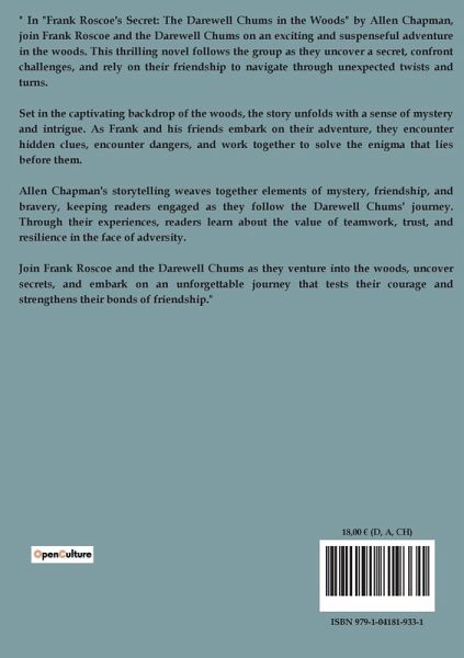 " In "Frank Roscoe's Secret: The Darewell Chums in the Woods" by Allen Chapman, join Frank Roscoe and the Darewell Chums on an exciting and suspenseful adventure in the woods. This thrilling novel follows the group as they uncover a secret, confront challenges, and rely on their friendship to navigate through unexpected twists and turns. Set in the captivating backdrop of the woods, the story unfolds with a sense of mystery and intrigue. As Frank and his friends embark on their adventure, they encounter hidden clues, encounter dangers, and work together to solve the enigma that lies before them. Allen Chapman's storytelling weaves together elements of mystery, friendship, and bravery, keeping readers engaged as they follow the Darewell Chums' journey. Through their experiences, readers learn about the value of teamwork, trust, and resilience in the face of adversity. Join Frank Roscoe and the Darewell Chums as they venture into the woods, uncover secrets, and embark on an unforgettable journey that tests their courage and strengthens their bonds of friendship."