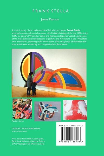 FRANK STELLA: AMERICAN ABSTRACT ARTIST By James Pearson Large Print Edition A study of the American abstract artist Frank Stella (b. 1936), surveying his career from the famous Black Paintings of the late 1950s up to the present day. Frank Stella has become become among America's premier contemporary artists. Unlike many modern artists, Stella has always worked in abstraction. His art is irrepressible, daring, hugely enjoyable, and refreshingly angst-free. This book begins with the celebrated Black Paintings of 1959, moves on through the Minimalist Copper and Aluminium paintings of the early Sixties, to the exuberant Protractor series, the expansion into three dimensions in the 1970s, and closing with the 3-dimensional Polish Village, Exotic Birds and Brazilian 'maximalist' works of the 1980s and 1990s. Employing the most up-to-date art criticism of Frank Stella, James Pearson also looks at Stella's contemporaries: Jasper Johns, Robert Rauschenberg, Kenneth Noland, Jules Olitski, Morris Louis, Robert Ryman, Brice Marden, Mark Rothko and Barnett Newman among others. Includes new illustrations, and quotes from the artist. EXTRACT FROM CHAPTER 5 There does not seem to be much going on in some of Frank Stella's 1960s Minimal paintings. But there is, in fact, a lot going on. Stella limits himself to a narrow set of rules. Like Brice Marden, Barnett Newman, Morris Louis and Mark Rothko, Stella sets himself to explore a few configurations of painting. But these things - the shape of the canvas, internal organization of the stripes, colour of the bands - offer up endless permutations.Frank Stella's paintings are lean, but leanness does not necessarily mean unfeelingness. This is the problem that monochrome painting creates, and Minimal art in general. Certainly Stella is intense: his Black Stripe Paintings, his Protractor series, his copper paintings, his India Birds, are intense works of art. The Frank Stella exhibitions of the late 1980s and early 1990s were affairs, in which one was impressed by a sense of colour and light, a spaciousness to the works, and a huge scale, so that each work dominated the gallery rooms. Stella is in no way a quiet, unobtrusive artist: his paintings are domineering, self-confident, assured of their own effects. Stella has always been an artist who knows what he's doing. His paintings do not lurk in gallery corners, shyly. His paintings announce themselves instantly and powerfully. Stella's June-July 1985 show at the ICA in London was typical: massive multi-media works were squeezed into the ubiquitous sparse white rooms, completely taking over the sedate spaces. Fully illustrated, with a revised text. Bibliography and notes. www.crmoon.com