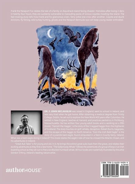 Frank the Newport Fox relates the tale of a family on Aquidneck Island facing disaster. Homeless after losing 2 dens in twenty-four hours, they are suddenly vulnerable to marauding packs of vicious coyotes invading the island. The fast moving story tells how Frank and his glamorous vixen, Terry solve one crisis after another. Coyote and skunk evictions, fly fishing, wild turkey hunting, ghosts and the Newport Bermuda race will keep young reader enthralled.