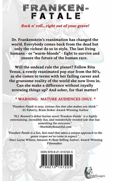 Dr. Frankenstein's reanimation has changed the world. Everybody comes back from the dead but only the richest do so in style . The last living humans - or "warm-bloods" - fight to survive and ensure the future of the human race. Will the undead rule the planet? Follow Rita Venus, a rowdy reanimated pop star from the 80's, as she comes to terms with her failing career and the gruesome reality of the world she now lives in. Can she make a difference without royally screwing things up? And sober, for that matter? *WARNING: "Franken-Fatale" is for MATURE AUDIENCES ONLY. Story contains drugs, violence, sex, language, and unsettling themes.