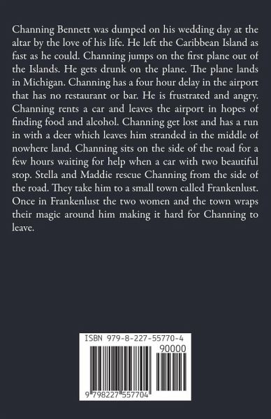Channing Bennett was dumped on his wedding day at the altar by the love of his life. He left the Caribbean Island as fast as he could. Channing jumps on the first plane out of the Islands. He gets drunk on the plane. The plane lands in Michigan. Channing has a four hour delay in the airport that has no restaurant or bar. He is frustrated and angry. Channing rents a car and leaves the airport in hopes of finding food and alcohol. Channing get lost and has a run in with a deer which leaves him stranded in the middle of nowhere land. Channing sits on the side of the road for a few hours waiting for help when a car with two beautiful stop. Stella and Maddie rescue Channing from the side of the road. They take him to a small town called Frankenlust. Once in Frankenlust the two women and the town wraps their magic around him making it hard for Channing to leave.