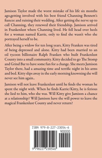 Jamison Taylor made the worst mistake of his life six months ago,getting involved with his best friend Channing Bennett's fiancee and ruining their wedding. After getting the nerve up to call Channing, they renewed their friendship. Jamison arrived in Frankenlust where Channing lived. He fell head over heels for a woman named Karrie, only to find she wasn't who she portrayed herself to be. After being a widow for ten long years, Kitty Franken was tired of being depressed and alone. Kitty had been married to an oil tycoon billionaire Ralph Franken who built Frankenlust County into a small community. Kitty decided to go The Stomp and Grind Bar to have some fun for a change. She meets Jamison Taylor there, had a amazing time and terrific night in his arms and bed. Kitty slips away in the early morning knowning she will never see him again.. Jamison will not leave Frankenlust until he finds the woman he spent the night with. When he finds Karrie/Kitty, he is ferious she lied to him, who she was. Will Kitty give Jamison a chance at a relationship? Will Jamison have the will power to leave the magical Frankenlust County and never return?