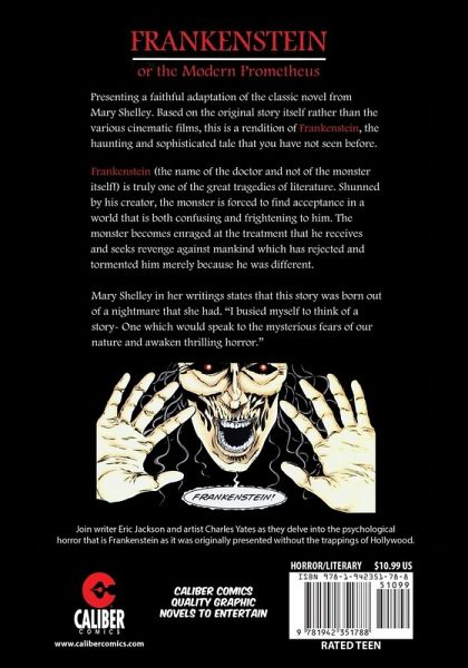 Presenting a faithful adaptation of the classic novel from Mary Shelley. Based on the original story itself rather than the various cinematic films, this is a rendition of Frankenstein, the haunting and sophisticated tale that you may not have seen before. Frankenstein (the name of the doctor and not of the monster itself!) is truly one of the great tragedies in written literature. Shunned by his creator, the monster is forced to find acceptance in a world that is both confusing and frightening to him. The monster becomes enraged at the treatment that he receives and seeks revenge against mankind which has rejected and tormented him merely because he is different. And the focus of his rage? His creator. Join writer Eric Jackson and artist Charles Yates as they delve into the psychological horror that is Frankenstein.