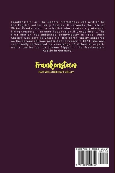 Do you want to read Frankenstein? If so then keep reading... Frankenstein; or, The Modern Prometheus was written by the English author Mary Shelley. It recounts the tale of Victor Frankenstein, a scientist who creates a grotesque, living creature in an unorthodox scientific experiment. The first edition was published anonymously in 1818, when Shelley was only 20 years old. Her name finally appeared on the second edition, published in France in 1823. She was supposedly influenced by knowledge of alchemist experiments carried out by Johann Dippel in the Frankenstein Castle in Germany. What are you waiting for Frankenstein is one click away, select the "Buy Now" button in the top right corner NOW!