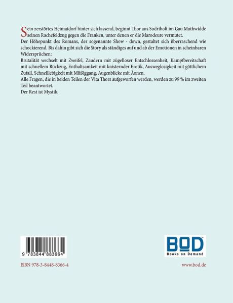 Sein zerstörtes Heimatdorf hinter sich lassend, beginnt Thor aus Sudriholt im Gau Muthwidde seinen Rachefeldzug gegen die Franken, unter denen er die Marodeure vermutet. Der Höhepunkt des Romans, der sogenannte Show - down, gestaltet sich überraschend wie schockierend. Bis dahin gibt sich die Story als ständiges auf und ab der Emotionen in scheinbaren Widersprüchen: Brutalität wechselt mit Zweifel, Zaudern mit zügelloser Entschlossenheit, Kampfbereitschaft mit schnellem Rückzug, Enthaltsamkeit mit knisternder Erotik, Ausweglosigkeit mit göttlichem Zufall, Schnelllebigkeit mit Müßiggang, Augenblicke mit Äonen.Alle Fragen, die in beiden Teilen der Vita Thors aufgeworfen werden, werden zu 99 % im zweiten Teil beantwortet. Der Rest ist Mystik.