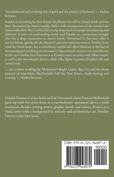"An emotional and involving tale of grief and the powers of darkness." - Kirkus Reviews Frankie is mourning her best friend. She blames herself for Anna's death and has been threatened by Anna's wealthy father with consequences if she reveals how Anna really died. She is in free fall, trying desperately to escape into partying and oblivion. A series of confounding events lead Frankie to a mysterious stranger with a deep connection to Anna's family. Tormented by her past, Alba is out for blood, specifically the blood of men who mistreat women. Frankie loves with her whole heart; she is relentlessly candid and often hilarious in the face of devastating and terrifying circumstances. Supernatural creatures run interference in this neo-Gothic East Vancouver as Frankie comes to terms with Alba's nature, as well as her own deepest desires, while Alba fights to protect Frankie's life and mortal soul. "... raw realism recalling Jay McInerney's Bright Lights, Big City and the sharp lyricism of Ann-Marie MacDonald's Fall On Your Knees... both moving and exciting." - Kirkus Reviews