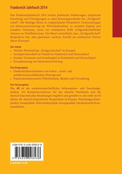 Das Frankreichjahrbuch 2014 vereint praktische Erfahrungen, empirische Forschung und Überlegungen zu einer Konzeptgeschichte der "Zivilgesellschaft". Die Beiträge bieten in vergleichender Perspektive Untersuchungen zur Interessenvertretung im Wirtschaftssektor, zu sozialem Kapital und sozialem Vertrauen, sowie zur veränderten Rolle zivilgesellschaftlicher Akteure im Wohlfahrtsstaat. Der Band verdeutlicht, dass "Zivilgesellschaft" Konjunktur hat, aber gleichsam wachsen Zweifel am politischen Nutzen dieses Konzepts.