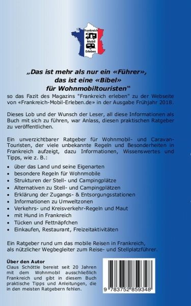 ACHTUNG: Neuere Ausgabe lieferbar.2. aktualisierte Ausgabe vom 17.02.2020 mit 33 % mehr Inhalt (ISBN 9783752894165)"Das ist mehr als nur ein «Führer», das ist eine «Bibel» für Wohnmobiltouristen",so das Fazit des Magazins "Frankreich Erleben" zu der Webseite von «Frankreich-Mobil-Erleben.de» in der Ausgabe Frühjahr 2018.Ein unverzichtbarer Ratgeber für Wohnmobil- und Caravan-Touristen, der viele unbekannte Regeln und Besonderheiten in Frankreich aufzeigt, dazu Informationen, Wissenswertes, Anleitungen und zahlreiche Tipps, wie z.B.:_ über das Land und seine Eigenarten_ besondere Regeln für Wohnmobile_ Strukturen der Stell- und Campingplätze_ Alternativen zu Stell- und Campingplätze_ Erklärung und Anleitung der Schrankensysteme und Entsorgungsstationen an Stellplätzen._Verkehrs- und Kreisverkehr-Regeln und Mautsysteme_ mit Hund in Frankreich_ Tücken und Fettnäpfchen_ Einkaufen, Restaurant, Freizeitaktivitäten_ und vieles mehrEin Ratgeber rund um das mobile Reisen in Frankreich, als nützlicher Wegbegleiter zum Reise- und Stellplatzführer.