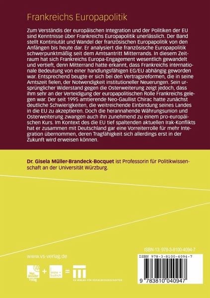 Zum Verständnis der europäischen Integration und der Politiken der EU sind Kenntnisse über Frankreichs Europapolitik unerlässlich. Der Band stellt Kontinuität und Wandel der französischen Europapolitik von den Anfängen bis heute dar. Er analysiert die französische Europapolitik schwerpunktmäßig seit dem Amtsantritt Mitterrands. In diesem Zeitraum hat sich Frankreichs Europa-Engagement wesentlich gewandelt und vertieft, denn Mitterrand hatte erkannt, dass Frankreichs internationale Bedeutung von einer handlungsfähigen EG/EU abhängig geworden war. Entsprechend beugte er sich bei den Vertragsreformen, die in seine Amtszeit fielen, der Notwendigkeit institutioneller Neuerungen. Sein ursprünglicher Widerstand gegen die Osterweiterung zeigt jedoch, dass ihm sehr an der Verteidigung der europapolitischen Rolle Frankreichs gelegen war. Der seit 1995 amtierende Neo-Gaullist Chirac hatte zunächst deutliche Schwierigkeiten, die weitreichende Einbindung seines Landes in die EU zu akzeptieren. Doch die herannahende Währungsunion und Osterweiterung zwangen auch ihn zunehmend zu einem pro-europäischen Kurs. Im Kontext des die EU tief spaltenden aktuellen Irak-Konflikts hat er zusammen mit Deutschland gar eine Vorreiterrolle für mehr Integration übernommen, deren Tragfähigkeit sich allerdings erst in der Zukunft wird erweisen können.