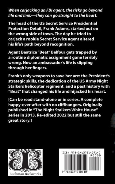 When carjacking an FBI agent, the risks go beyond life and limb-they can go straight to the heart. The head of the US Secret Service Presidential Protection Detail, Frank Adams, started out on the wrong side of town. The day he tried to carjack a rookie Secret Service agent altered his life's path beyond recognition. Agent Beatrice "Beat" Belfour gets trapped by a routine diplomatic assignment gone terribly wrong. Now an ambassador's life is slipping through her fingers. Frank's only weapons to save her are: the President's strategic skills, the dedication of the US Army Night Stalkers helicopter regiment, and a past history with "Beat" that changed his life and hijacked his heart. [Can be read stand-alone or in series. A complete happy-ever-after with no cliffhangers. Originally published in "The Night Stalkers White House" series in 2013. Re-edited 2022 but still the same great story.] Buy now and celebrate the Independence Day holidays.