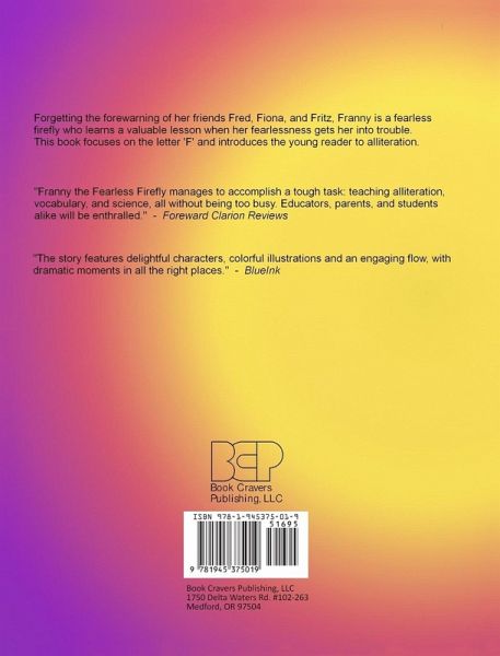 Forgetting the forewarning of her friends Fred, Fiona, and Fritz, Franny is a fearless firefly who learns a valuable lesson when her fearlessness gets her into trouble. This book focuses on the letter 'F' and introduces the young reader to alliteration.