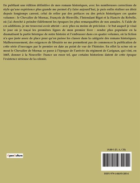 Texte à corriger : "François de Bienville" de Joseph Marmette est un roman historique qui plonge le lecteur dans la vie canadienne du XVIIe siècle, en pleine Nouvelle-France. L'histoire débute en 1690, alors que le comte de Frontenac, gouverneur de la Nouvelle-France, revient à Québec pour organiser la défense de la ville contre une flotte anglaise menaçante. Accompagné de François Le Moyne de Bienville, un jeune officier prometteur, Frontenac doit faire face à une situation critique. Le récit s'attarde sur les préparatifs de défense de Québec, les tensions politiques et militaires, ainsi que sur les relations personnelles entre les personnages principaux. Bienville, issu d'une famille de héros, se distingue par son courage et son dévouement à la cause française. Le roman explore également les intrigues amoureuses et les rivalités, passant par le personnage de Marie-Louise d'Orsy, sur de Louis d'Orsy, qui attire l'attention d'un officier anglais, Harthing. Le contexte historique est richement détaillé, offrant une immersion dans la vie quotidienne et les défis de l'époque. Marmette réussit à mêler fiction et faits historiques, rendant hommage aux héros méconnus de la Nouvelle-France tout en guidant le lecteur par une narration vivante et dramatique.