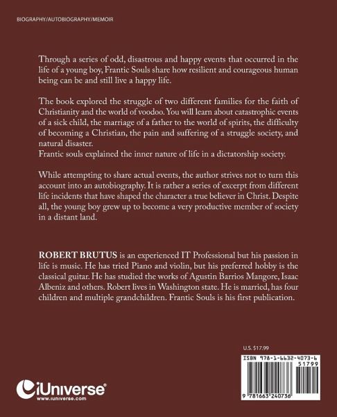 Through a series of odd, disastrous and happy events that occurred in the life of a young boy, Frantic Souls share how resilient and courageous human being can be and still live a happy life. The book explored the struggle of two different families for the faith of Christianity and the world of voodoo. You will learn about catastrophic events of a sick child, the marriage of a father to the world of spirits, the difficulty of becoming a Christian, the pain and suffering of a struggle society, and natural disaster. Frantic souls explained the inner nature of life in a dictatorship society. While attempting to share actual events, the author strives not to turn this account into an autobiography. It is rather a series of excerpt from different life incidents that have shaped the character a true believer in Christ. Despite all, the young boy grew up to become a very productive member of society in a distant land.