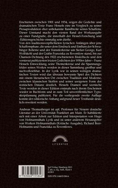 Erschienen zwischen 1901 und 1934, zeigen die Gedichte und dramatischen Texte Franz Hessels eine im Vergleich zu seiner Prosaproduktion eher unbekannte Bandbreite seines Schaffens. Dieser Umstand macht den vierten Band der Werkausgabe zu einer Fundgrube, die innerhalb der Hessel-Forschung und -Editionsgeschichte einmalig sein dürfte.
