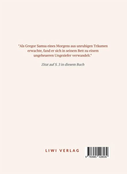 "Als Gregor Samsa eines Morgens aus unruhigen Träumen erwachte, fand er sich in seinem Bett zu einem ungeheueren Ungeziefer verwandelt." (Zitat auf S. 3 in diesem Buch) In "Die Verwandlung" von Franz Kafka wird Gregor Samsa plötzlich zum Käfer, was sein Leben und seine Beziehungen tiefgreifend verändert. Die Geschichte ist eine meisterhafte Allegorie über die Zerbrechlichkeit der menschlichen Existenz und die Realität des Andersseins. Die Novelle bleibt ein psychologisches und gesellschaftskritisches Meisterwerk, das tief in die Abgründe menschlicher Beziehungen eintaucht. Hier frisch aufgelegt in gut lesbarer Schriftgröße. Franz Kafka. Die Verwandlung. Erstdruck in: Die Weißen Blätter. Eine Monatsschrift. Hrsg. von René Schickele, S. 1177¿1230, Verlag der weißen Bücher, Jg. 2, H. 10 (Oktober), Leipzig 1915. Erstausgabe als Buch in der Reihe Der jüngste Tag, Kurt Wolf Verlag, Leipzig 1916 (tatsächlich erschienen bereits im Dezember 1915). Durchgesehener Neusatz, der Text dieser Ausgabe folgt: Franz Kafka: Die Verwandlung und andere Erzählungen, Tholenaar Verlag, Morsbach 1984. Vollständige Neuausgabe, Göttingen 2024. LIWI Literatur- und Wissenschaftsverlag