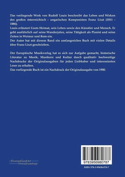 Das vorliegende Werk von Rudolf Louis beschreibt das Leben und Wirken des großen österreichisch - ungarischen Komponisten Franz Liszt (1811 - 1886). Louis erläutert Liszts Heimat, sein Leben sowie den Künstler und Mensch. Er geht ausführlich auf seine Wanderjahre, seine Tätigkeit als Pianist und seine Zeiten in Weimar und Rom ein. Der Autor hat mit diesem Band ein umfangreiches Buch mit vielen Details über Franz Liszt geschrieben. Der Europäische Musikverlag hat es sich zur Aufgabe gemacht, historische Literatur zu Musik, Musikern und Kultur durch qualitativ hochwertige Nachdrucke der Originalausgaben für jeden Liebhaber und interessierten Leser zu erhalten. Das vorliegende Buch ist ein Nachdruck der Originalausgabe von 1900.