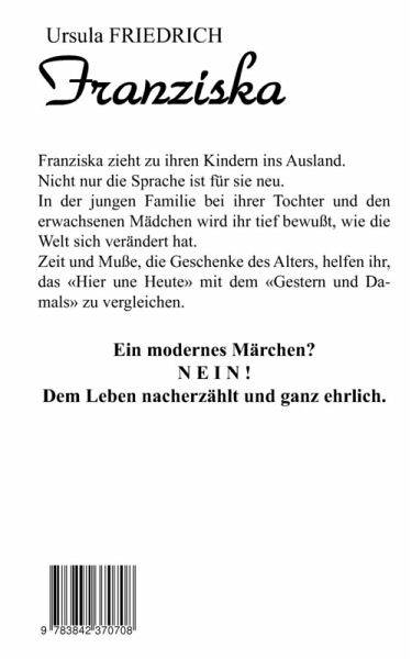 Franziska zieht zu ihren Kindern ins Ausland. Nicht nur die Sprache ist für sie neu. In der jungen Familie bei ihrer Tochter und den erwachsenen Mädchen wird ihr tief bewusst, wie die Welt sich verändert hat. Zeit und Muße, die Geschenke des Alters, helfen ihr, das "Hier und Heute" mit dem "Gestern und Damals" zu vergleichen.