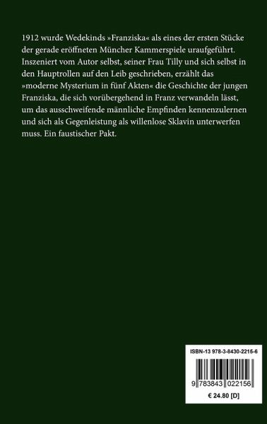 Frank Wedekind: Franziska. Ein modernes Mysterium in fünf Akten 1912 wurde Wedekinds »Franziska« als eines der ersten Stücke der gerade eröffneten Müncher Kammerspiele uraufgeführt. Inszeniert vom Autor selbst, seiner Frau Tilly und sich selbst in den Hauptrollen auf den Leib geschrieben, erzählt das »moderne Mysterium in fünf Akten« die Geschichte der jungen Franziska, die sich vorübergehend in Franz verwandeln lässt, um das ausschweifende männliche Empfinden kennenzulernen und sich als Gegenleistung als willenlose Sklavin unterwerfen muss. Ein faustischer Pakt. Entstanden 1911. Erstdruck: München (Georg Müller) 1912. Uraufführung am 20.11.1912, Lustspielhaus (Kammerspiele), München. Neuausgabe mit einer Biographie des Autors. Herausgegeben von Karl-Maria Guth. Berlin 2013. Textgrundlage ist die Ausgabe: Wedekind, Frank: Franziska. Ein modernes Mysterium in fünf Akten, München: Georg Müller, 1912. Die Paginierung obiger Ausgabe wird in dieser Neuausgabe als Marginalie zeilengenau mitgeführt. Umschlaggestaltung von Thomas Schultz-Overhage unter Verwendung des Bildes: Iwan Nikolajewitsch Kramskoj, Die Unbekannte (Ausschnitt), 1883. Gesetzt aus Minion Pro, 11 pt.