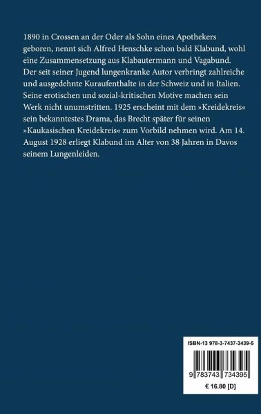 1890 in Crossen an der Oder als Sohn eines Apothekers geboren, nennt sich Alfred Henschke schon bald Klabund, wohl eine Zusammensetzung aus Klabautermann und Vagabund. Der seit seiner Jugend lungenkranke Autor verbringt zahlreiche und ausgedehnte Kuraufenthalte in der Schweiz und in Italien. Seine erotischen und sozial-kritischen Motive machen sein Werk nicht unumstritten. 1925 erscheint mit dem "Kreidekreis" sein bekanntestes Drama, das Brecht später für seinen "Kaukasischen Kreidekreis" zum Vorbild nehmen wird. Am 14. August 1928 erliegt Klabund im Alter von 38 Jahren in Davos seinem Lungenleiden.