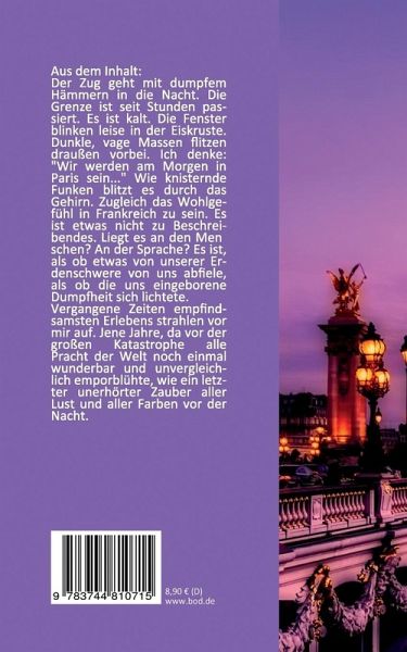 Der Zug geht mit dumpfem Hämmern in die Nacht. Die Grenze ist seit Stunden passiert. Es ist kalt. Die Fenster blinken leise in der Eiskruste. Dunkle, vage Massen flitzen draußen vorbei. Ich denke: "Wir werden am Morgen in Paris sein ..." Wie knisternde Funken blitzt es durch das Gehirn. Zugleich das Wohlgefühl, in Frankreich zu sein. Es ist etwas nicht zu Beschreibendes. Liegt es an den Menschen? An der Sprache? Es ist, als ob etwas von unserer Erdenschwere von uns abfiele, als ob die uns eingeborene Dumpfheit sich lichtete.Vergangene Zeiten empfindsamsten Erlebens strahlen vor mir auf. Jene Jahre, da vor der großen Katastrophe alle Pracht der Welt noch einmal wunderbar und unvergleichlich emporblühte, wie ein letzter unerhörter Zauber aller Lust und aller Farben vor der Nacht.
